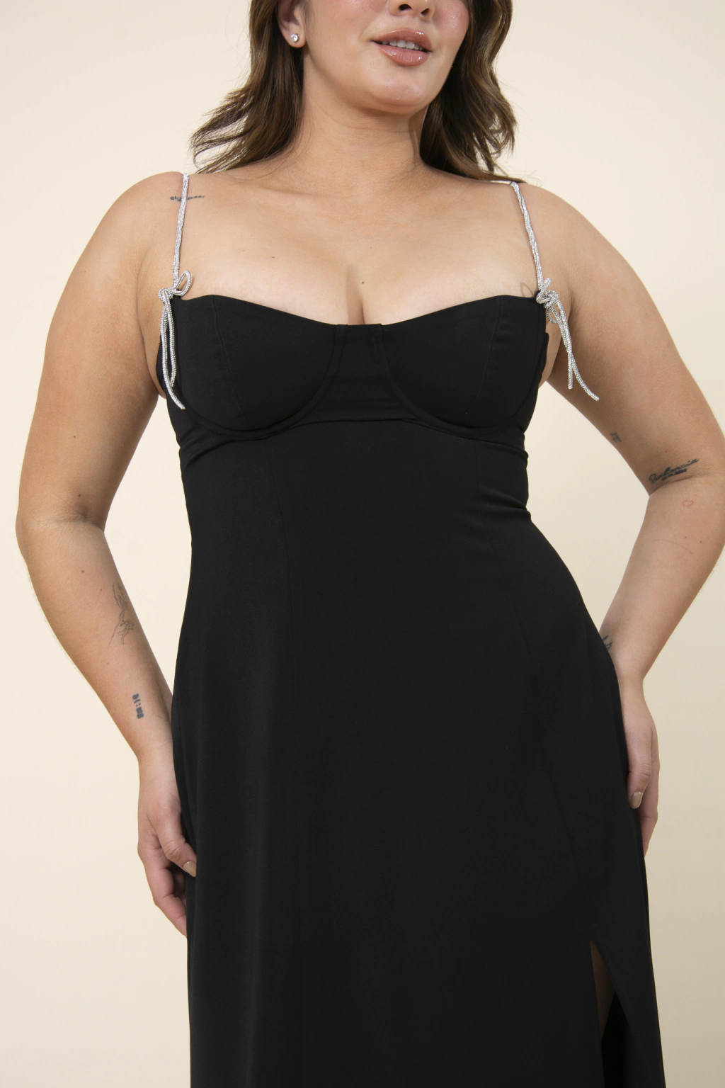 Confeccionado en crepe sastrero, cuenta con tazas dobles con arco metálico que brindan un excelente sostén al busto, forradas en el mismo material. Los breteles y moños bordados en cordón de strass son detalles únicos que realzan su elegancia.