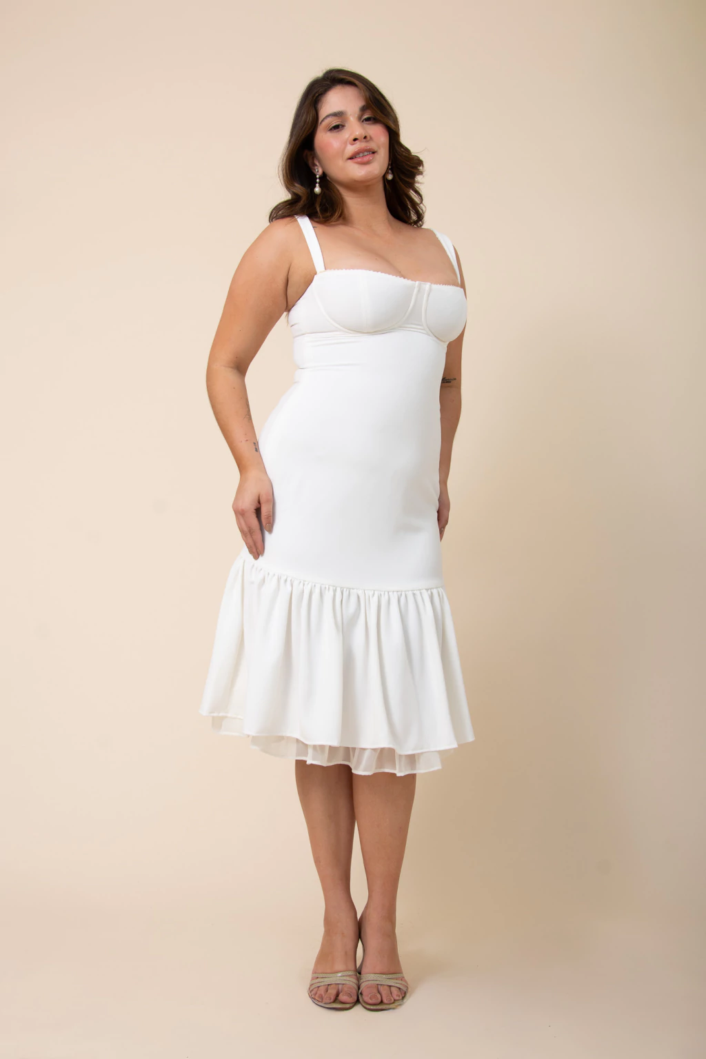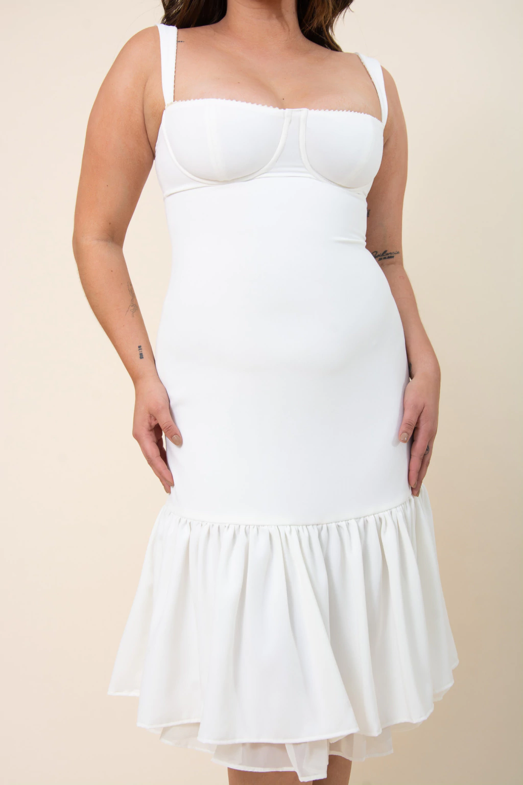 Descubrí el White Bouquet Dress, un vestido midi que realza tu silueta con su elegante diseño sirena y delicado fruncido en la falda. Confeccionado en crepe sastrero off white, cuenta con forrería en microcrepe para mayor confort y una enagua de gasa a tono que aporta sofisticación y movimiento.
